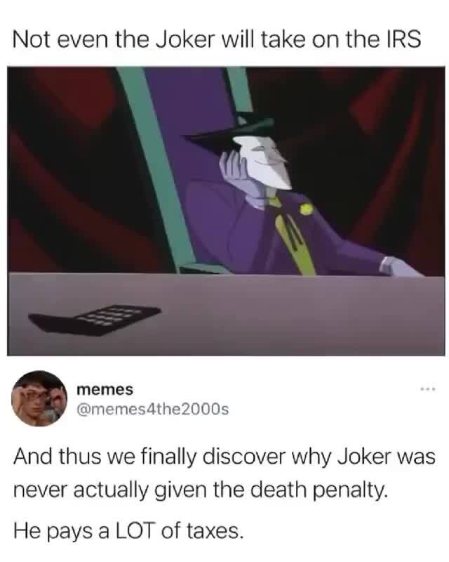 The irs suspected a fishing boat owner wasn’t paying proper wages to his deckhands and sent an agent to investigate him. Thot audit is an online campaign urging people to report online sex workers to the irs so that they would be audited for unreported income. 10 times the joker was actually funny (in the comics) the golden age joker had a pension for hilariously trying to defeat the dark knight. Images, gifs and videos featured seven times a day. ๐ prequel memes ๐ถ doggo memes ๐จ 9 11 memes ๐. With his twisted mind and cruel actions, many may forget that the joker started off as a somewhat ridiculous villain. Even joker want none of irs xd #joker #memes #meme #dccomics #irs. With tenor, maker of gif keyboard, add popular irs animated gifs to your conversations. Joker won't take on the irs.